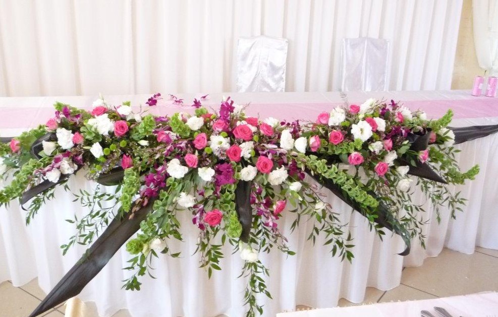 Kompozycja na stole Młodych z fioletowo białej eustomy, różowej róży, białego gożdzika gałązkowego i ruskusa